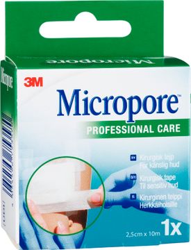 Micropore vit refill, 25 mm x 10 m. 3M™ Micropore™ Kirurgisk tejp är det pålitliga valet av en hudvänlig, allsidig mikroporös papperstejp. Det hypoallergena häftämnet är skonsamt vid känslig och skör hud. Då tejpen är mycket porös och andas tillåter den fukt att passera utan att försämra vidhäftningen. 3M™ Micropore™ Kirurgisk tejp är tunn, mjuk och flexibel för ökad patientkomfort. Den är lätt att riva i rätt storlek för snabb och enkel applicering. Finns tillgänglig i färgerna vit och brun, vilket gör den lämplig vid ansiktsförband. Röntgengenomsläpplig.