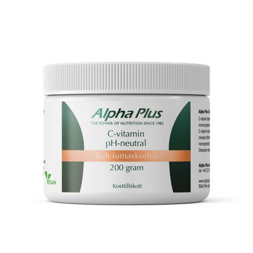 Alpha Plus ph-neutrala C-vitamin (askorbinsyra) bidrar till immunsystemets normala funktion samt till att skydda cellerna mot oxidativ stress. C-vitamin bidrar även till normal kollagenbildning och till att minska trötthet och utmattning samt till nervsystemets normala funktion.Kalciumaskorbat är ett kalciumsalt av askorbinsyra. Salter av askorbinsyra kallas askorbater. Kalciumaskorbat är pH-neutralt vilket bland annat gör att du kan inta större doser utan att påverka mage och tarm. En annan fördel är att askorbinsyrans salter lättare kan lösa sig med andra ämnen och livsmedel.