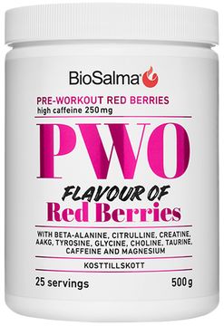 Innehåller sötningsmedel. BioSalma® PWO, high concentrate är ett kosttillskott särskilt framtaget för dig som vill få ut mer av dina träningspass. Produkten innehåller en noggrant avvägd kombination av aminosyror, elektrolyter, koffein och kreatin – tillsammans med en uppfriskande smak av röda bär. Produkten är lättlöslig och passar perfekt före gymmet, konditionspassen eller intensiva sportaktiviteter. Produkten innehåller kreatin och är särskilt avsedd för vuxna som tränar högintensivt.