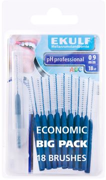 EKULF pH professional 0,9 mm ger dig en effektiv och skonsam rengöring mellan tänderna och ingår i serien pH professional mellanrumstandborstar från EKULF. Borsthuvudet är tillverkat av högsta precision med mellan 400 och 600 små borststrån och rengör effektivt tandmellanrummens ojämnheter samt tandköttsraden.EKULF pH professional är en komplett serie för alla tandmellanrum, framtagen för den Svenska Apoteksmarknaden. Färgkodningen på storlekarna är enligt svensk apoteksstandard.