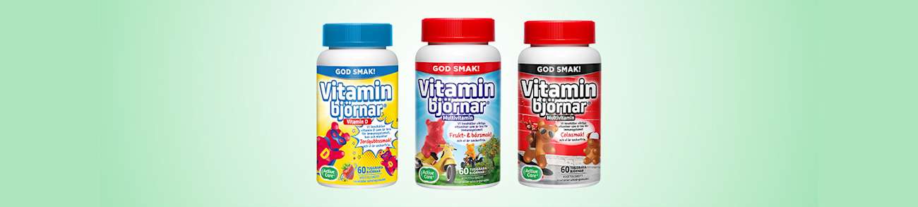 Varje björn innehåller 9 vitaminer – bland annat D, C och B12. Utforska vårt sortiment av vitaminer från Active Care