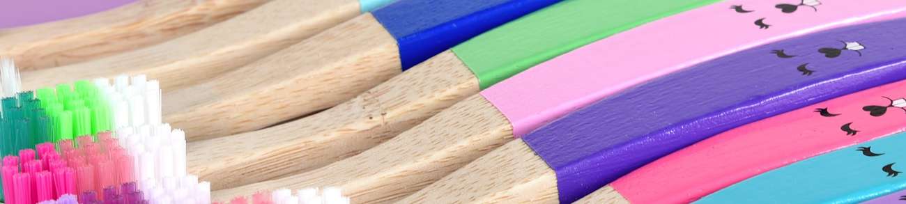 Vår FSC-certifierade bambu är en oändligt förnybar resurs och 100% biologiskt nedbrytbar. Designen och storleken är anpassade efter barns behov med mjuka borststrån tillverkade i nylon-4 helt utan BPA och PVC. Skaftet är infärgat i miljövänlig certifierad naturfärg, vilket skyddar bambun vid väta. Förpackningen är 100% plastfri med färg i sojaprint.