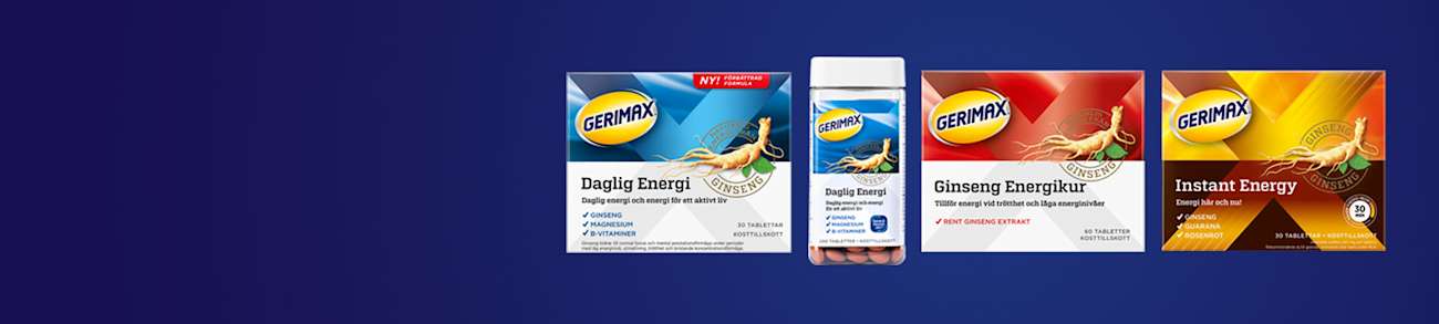 Gerimax Daglig Energi innehåller ginseng, magnesium och B-vitaminer. Gerimax Performance kombinerar ginseng med rosenrot och guarana. Utforska sortimentet och hitta det som passar dig.
