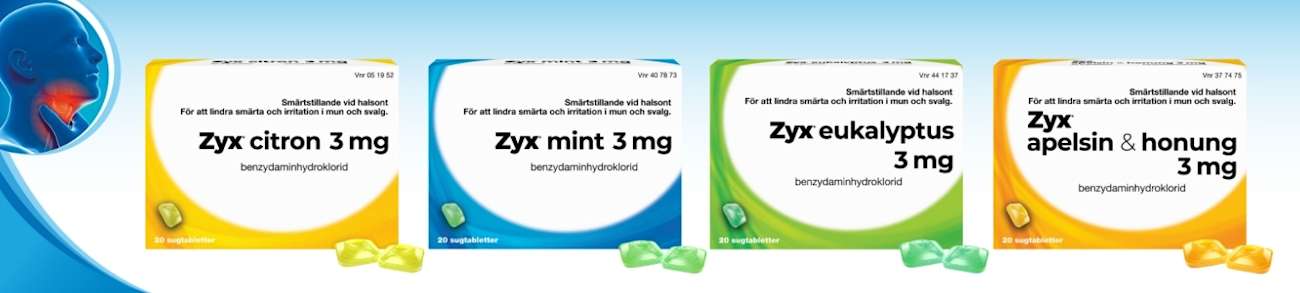 Zyx mot halsont Zyx är ett receptfritt läkemedel som lindrar halsont, smärta och irritation i mun och svalg. Sugtabletterna har smärtlindrande, antiinflammatorisk och lätt lokalbedövande effekt som minskar obehag och underlättar vid sväljsvårigheter.