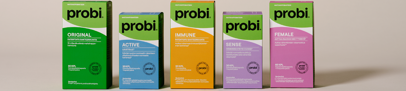 I sortimentet finns probiotiska kosttillskott anpassade för olika behov och åldrar. Förutom Probi Original finns Probi Female, speciellt framtagen för kvinnor, Probi Immune som bidrar till ett välfungerande immunsystem, Probi Sense som främjar koncentrationsförmåga och minskar trötthet, samt Probi Active som bidrar till att bibehålla en normal benstomme.