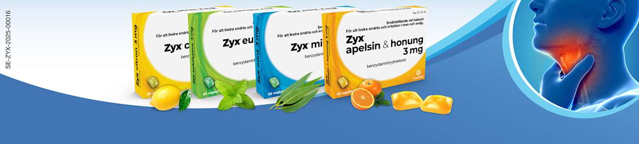 Zyx sugtabletter är ett receptfritt läkemedel för att lindra halsont. Smärtlindringen, den lätta lokalbedövningen samt den antiinflammatoriska effekten minskar sväljsvårigheter, svullnad, irritation och smärta i mun och svalg. Du får snabb smärtlindring inom 12 minuter. Zyx kan användas av vuxna och barn från 6 år och den är sockerfri, för tändernas skull. Sugtabletten ska smälta långsamt i munnen och maxdosen är tre sugtabletter om dagen i högst sju dagar.