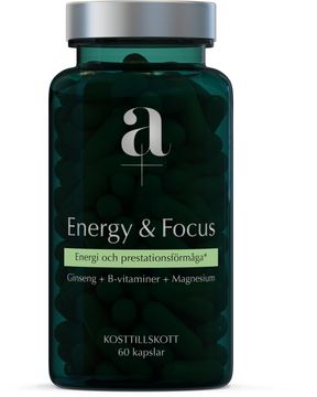 A + Energy & Focus innehåller en sammansättning av viktiga B-vitaminer, C-vitamin, Magnesium och den välkända örten Panax Ginseng. Magnesium, C-vitamin, vitamin B6 och vitamin B12 bidrar bland annat till normal energiomsättning. Vitamin B12, pantotensyra och magnesium bidrar till att minska trötthet och utmattning. Pantotensyra bidrar till normal mental prestationsförmåga. Panax Ginseng kan hjälpa till att bibehålla en fysisk och mental kapacitet. Rekommenderad daglig dos: 1 kapsel dagligen med måltid.