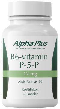 Alpha Plus B6-vitamin P-5-P innehåller 12 mg vitamin B6 i form av pyridoxal-5-fosfat – den aktiva formen som kroppen inte behöver omvandla. Vitamin B6 är ett viktigt näringsämne som bidrar till normal energiomsättning, till att minska trötthet och utmattning, samt till nervsystemets och immunsystemets normala funktion.Dessutom spelar vitamin B6 en viktig roll i kroppens hormonella reglering. Ett tillskott för dig som vill säkerställa ett effektivt upptag av B6 i aktiv form.