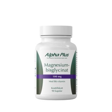 Alpha Plus Magnesiumbisglycinat 100 mg innehåller rent magnesiumbisglycinat och är inte buffrad med någon annan magnesiumform. Magnesium bidrar till att minska trötthet och utmattning, till normal energiomsättning och till nervsystemets normala funktion. Det bidrar även till att bibehålla en normal benstomme och normal muskelfunktion.