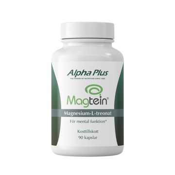 Alpha Plus Magtein® Magnesium-L-treonat innehåller en patenterad form av magnesium bunden till L-treonat – en sammansättning som utvecklats särskilt med fokus på upptag i nervsystemet. Produkten ger 2000 mg magnesium-L-treonat per dagsdos, vilket motsvarar 144 mg magnesium.Magnesium är ett essentiellt mineral som bidrar till nervsystemets normala funktion och till normal psykologisk funktion. Det spelar också en roll i att minska trötthet och utmattning.Magtein® är ett registrerat varumärke licensierat av ThreoTech LLC och är ett alternativ för dig som söker ett magnesiumtillskott med särskilt fokus på kognitivt stöd.
