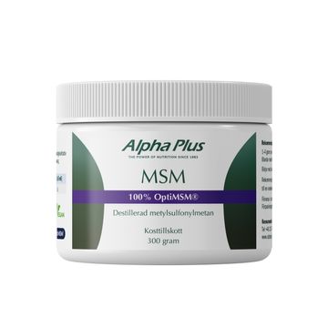 Alpha Plus MSM 300 gram består av 100 % OptiMSM® – en ren form av metylsulfonylmetan (MSM), framställd genom destillering för att säkerställa hög renhet och jämn kvalitet. MSM är en svavelförening som förekommer naturligt i kroppen och i vissa livsmedel, men kan gå förlorad vid upphettning och processning.OptiMSM® är en välkänd och certifierad råvara som erbjuder ett tillförlitligt sätt att tillföra svavel i form av ett lättlösligt pulver. Produkten innehåller inga tillsatser och består enbart av OptiMSM®, vilket gör den till ett rent och funktionellt val för dig som vill komplettera med MSM i pulverform.