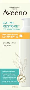 Ansiktskräm med SPF50 som intensivt återfuktar samtidigt som den skyddar huden mot skadliga UV-strålar. Innehåller prebiotisk havre, känd för att hjälpa till att lugna och reparera huden genom att återställa hudens fuktbarriär. Innehåller även lugnande feverfew, känd för sin egenskap som antioxidant och för att hjälpa till att lugna huden. Hypoallergen (formulerad för att minimera risken för allergi) och icke-komedogen. Dermatologiskt testad, oparfymerad, snabbabsorberande ansiktskräm med hyaluronsyra. För normal, torr och känslig hud. Applicera rikligt på ansikte och hals som det sista steget i din hudvårdsrutin. Om du vistas i solen rekommenderas daglig användning av solskydd.