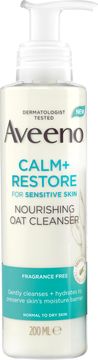 Aveeno CALM+RESTORE® Nourishing Oat Cleanser tar skonsamt bort smuts, orenheter och fett. Den är speciellt framtagen för normal till torr hud och återfuktar för att bevarar hudens fuktbarriär, vilket ger en lugnande och återfuktande känsla. Innehåller prebiotisk havre som hjälper till att lugna och reparera huden genom att återställa hudens fuktbarriär. Innehåller även lugnande feverfew, känd för sin egenskap som antioxidant och för att hjälpa till att lugna huden. Formulan är icke-komedogen, hypoallergen (formulerad för att minimera risken för allergi), oparfymerad och dermatologiskt testad.