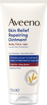 Aveeno® Skin Relief Repairing Ointment är formulerad för att snabbt lugna och reparera mycket torr och känslig hud på kropp, ansikte och läppar. Den stärker hudens naturliga fuktbarriär och skyddar effektivt mot torr och narig hud. Med trippelt havrekomplex (havremjöl + havreextrakt + havreolja) som förbättrar hudens naturliga balans och gör huden motståndskraftig så att den ser hälsosam ut från dag 1. Dessutom erbjuder den intensiv återfuktning i upp till 72 timmar.