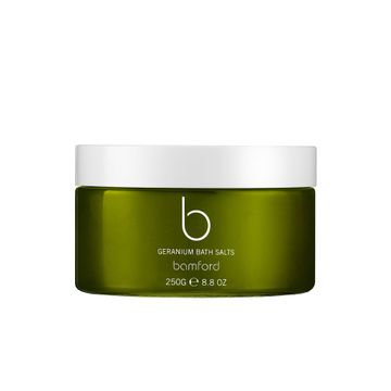Bamfords Geranium badsalt kombinerar hudmjukgörande Epsomsalt och djuprengörande havssalt för att lugna och återuppliva. Geraniumeterisk oljeblandning skapar balans för sinnet samtidigt som den mjukgör badvattnet och vårdar huden.