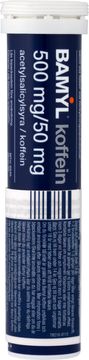Huvudvärk, tandvärk, menstruationssmärtor, feber vid förkylningssjukdomar, led- och muskelsmärtor och migrän. Bamyl koffein innehåller acetylsalicylsyra som har smärtstillande, inflammationshämmande och febernedsättande egenskaper. Koffein förstärker den smärtstillande effekten av acetylsalicylsyra. Koffein har även en smärtstillande effekt genom sin sammandragande verkan på utvidgade blodkärl i hjärnan t.ex. vid migrän. Koffein har även en uppiggande effekt.Bamyl koffein är en brustablett och därför tas acetylsalicylsyran snabbt upp av kroppen. Bamyl koffein brustabletter ger med vatten en klar lösning som är skonsammare mot magen än vanliga fasta tabletter med acetylsalicylsyra. Tabletten börjar vanligen verka inom cirka 30 minuter. Effekten är som störst efter 1-2 timmar.
