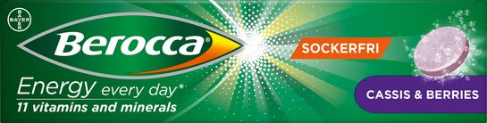Berocca® Energy Cassis & Berries är en sockerfri multivitamin i brustablettsformat med smak av svartvinbär och hallon. Brustabletterna innehåller en skräddarsydd blandning av 11 vitaminer och mineraler, bl.a. vitamin B2, B12, C och magnesium som bidrar till minskad trötthet och utmattning samt vitamin B5 som bidrar till normal mental prestationsförmåga. Berocca Energy är glutenfri, laktosfri och är lämplig för både vegetarianer och veganer.