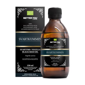 Ekologisk varsamt kallpressad och filtrerad svartkumminolja (Nigella sativa) från Egypten av högsta kvalité. Svartkumminfrön har en historia av att användas både för insidan och utsidan, vid matlagning och för hud- och hårvård. Oljan innehåller fleromättade fetter (omega-6) och enkelomättade fetter (omega-9) samt tymokinon.
