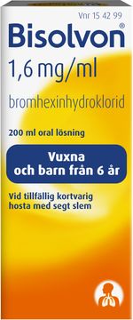 Bisolvon är en hostmedicin som används vid tillfällig kortvarig hosta med segt slem (slemhosta). När du har slemhosta behöver du hjälp med att få bort det tjocka och sega slemmet. Bisolvon hostmedicin anses lösa upp segt slem så att det blir mer tunnflytande och därmed lättare att hosta upp. Från 6 år. Bisolvon är ett receptfritt läkemedel, som innehåller det aktiva ämnet bromhexin. Läs bipacksedeln noga före användning.