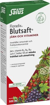 Floradix Blutsaft® flytande järn och vitaminer är ett kosttillskott som innehåller en organisk och lättabsorberad typ av järn - järnglukonat. Blutsafts järntillskott innehåller även örtextrakt, B-vitaminer samt C-vitamin i form av fruktjuicer som bidrar till att förbättra upptaget av järnet.