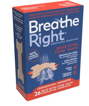 Breathe Right Näsplåster är helt fria från läkemedel. Det är kliniskt bevisat att plåstret öppnar upp näsan så att du kan andas lättare. Breathe Right Näsplåster har fjädrande remsor som försiktigt lyfter och öppnar upp näsan så att luften lättare kan passera.