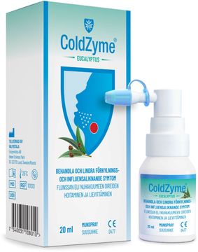 ColdZyme är en munspray som skyddar mot virus i de övre luftvägarna som orsakar förkylnings- och influensaliknande symtom. ColdZyme bildar en skyddande fuktgivande barriär på slemhinnan i munhålan och halsen. Barriären inaktiverar virus och hämmar deras förmåga att sprida och föröka sig. •ColdZyme skyddar mot virus som orsakar förkylnings- och influensaliknande infektioner i de övre luftvägarna. •ColdZyme förkortar varaktigheten för förkylnings- och influensaliknande infektioner i de övre luftvägarna om det används vid ett tidigt stadium av infektionen. •ColdZyme lindrar förkylnings- och influensaliknande symtom, inklusive halsont. ColdZyme kan användas vid förkylnings- och influensasymtom eller vid exponering för virus som orsakar dessa symtom i de övre luftvägarna. ColdZyme bildar direkt en barriär i munnen och halsen som fungerar på följande 3 sätt: •Fångar in: Barriären fångar virus. •Inaktiverar: Barriären hämmar därefter förmågan hos infångade virus att infektera celler och att föröka sig. •Skyddar: Den fysiska barriären täcker, fuktar och skyddar munhålan och halsen. Använd ColdZyme direkt när du riskerar att utsättas för virus i de övre luftvägarna eller så snart du känner symtom som liknar infektion i de övre luftvägarna, som visar sig t ex som ont i halsen eller nysningar. Fortsätt att använda ColdZyme® tills risk för smitta upphört eller symtomen minskat. ColdZyme är en munspray som skyddar mot virus i de övre luftvägarna som orsakar förkylnings- och influensaliknande symtom. ColdZyme är en lättanvänd munspray som aktivt riktar sig mot orsaken till förkylning och som kan användas när man riskerar att utsättas för förkylningsvirus eller tidigt under infektionen. Behandlar orsaken till förkylning genom att deaktivera upp till 99% av förkylningsvirus ColdZyme bildar en skyddande fuktgivande barriär på slemhinnan i munhålan och halsen. Barriären inaktiverar virus och hämmar deras förmåga att sprida och föröka sig. Behandla och lindra förkylnings- och influensaliknande symtom inklusive halsont. Kliniskt bevisad effekt. Kan förkorta förkylningen vid användning i ett tidigt stadium. Kan användas från 4 års ålde Använd ColdZyme direkt när du riskerar att utsättas för virus i de övre luftvägarna eller så snart du känner symtom som liknar infektion i de övre luftvägarna, som visar sig t ex som ont i halsen eller nysningar.