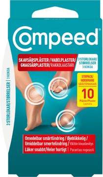 COMPEED® Mixpack skavsårsplåster består av 4 stycken medium plåster, 4 stycken small och 2 plåster för tårna. Skavsårsplåstrena från Compeed ger dig snabb smärtlindring och skön tryckavlastning. De fungerar som en andra hud för att hjälpa den naturliga fuktbalansen och skyddar mot bakterier. Perfekt för hela familjen och att ha i första hjälpen lådan. Låt plåstret sitta kvar tills det faller bort av sig själv. • Lindrar smärtan omedelbart • Skyddar från skoskav och tryckavlastar mot friktion • Påskyndar läkningsprocessen • Sitter på plats i flera dagar (kan variera från person till person).