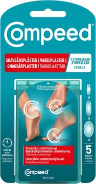 COMPEED® Mixpack skavsårsplåster består av 2 stycken medium plåster, 2 stycken small och 1 plåster för tårna. Skavsårsplåstrena från Compeed ger dig snabb smärtlindring och skön tryckavlastning. De fungerar som en andra hud för att hjälpa den naturliga fuktbalansen och skyddar mot bakterier. Perfekt för hela familjen och att ha i första hjälpen lådan. Låt plåstret sitta kvar tills det faller bort av sig själv. • Lindrar smärtan omedelbart • Skyddar från skoskav och tryckavlastar mot friktion • Påskyndar läkningsprocessen • Sitter på plats i flera dagar (kan variera från person till person).