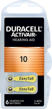 Knappscellsbatterier av zink/lufttyp för hörapparater. Helt utan kvicksilver. Typ 10-HPX för kanalapparater. Batterierna som är försedda med en skyddstejp startar när skyddtejpen tas bort och luft får tillträde till cellmassan. Förvaras torrt i rumstemperatur. 6 st.