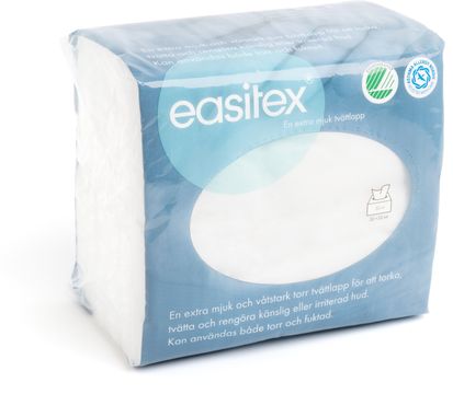 Skonsam, mycket mjuk även när torr kan användas fuktad, myckte hållfast. Användning vid blöjbyte, kroppsrengöring, rinnig näsa etc. Går ej sönder när blöt.