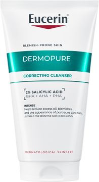 Eucerin Dermopure Correcting Cleanser är en intensiv rengöringsgel för oljig och aknebenägen hud på både ansiktet och kroppen. Den innehåller en serumkoncentration med 2% Salicylsyra (BHA), Glykolsyra (AHA) och Glukonolakton (PHA), som är kliniskt testad för att reducera finnar och akneärr, samtidigt som det hjälper till att stödja hudens mikrobiom. Effektiv från dag ett. Lämplig för känslig hud och från 12 år. - Intensiv rengöringsgel för oljig och aknebenägen hud - Hjälper till att minska på överflödig olja i huden - Hjälper till att minska finnar och mörka fläckar efter akne - Passar även känslig hud på ansikte och kropp - Från 12 år
