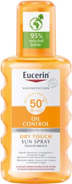 Eucerin Oil Control Dry Touch Sun Spray Transparent SPF 50+ är en solspray för kroppen som skapar en matt yta på huden. Den ultralätta formulan är transparent, icke-fet och kladdfri och absorberas snabbt. Passar alla hudtyper men är även lämplig för känslig och aknebenägen hud. Vattenresistent. 1. Kladdfritt solskydd som skapar en matt yta 2. Transparent spray med ultralätt konsistens 3. Icke-fet formula som absorberas snabbt 4. Vattenresistent 5. Passar även känslig och aknebenägen hud