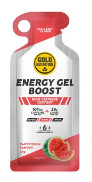 Fräsch vattenmelonspower – snabb och långvarig energi! Energy Gel Boost Watermelon kombinerar 107 mg koffein med 25 g kolhydrater i 2:1-glukos-fruktosmix per gel för optimal glukostransport utan magproblem. Den saftiga vattenmelonsmaken ger en upplyftande, törstsläckande känsla under långa pass. Koffeinet minskar trötthet, kolhydraterna håller energinivåerna uppe och natrium underlättar vätskebalansen. Utformad för maratonlöpare, cyklister och alla uthållighetsidrottare. Innehåller tillsatt socker och sötningsmedel