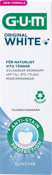 GUM® Original White återställer tändernas naturliga vithet.Tar bevisat bort upp till 97% av ytliga missfärgningar utan att skada emaljen med hjälp av högeffektiv silica.Skyddar mot karies och ger 24-timmars skydd mot ytliga fläckar.Skonsam formula, lämplig för daglig användning.Fluoridjoner (1450 ppm) hjälper till att förstärka och skydda tandens emalj.Innehåller Vitamin E.uor.