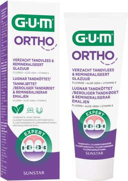 GUM ORTHO Fluoridtandkräm. Skyddar mot karies med hög fluoridhalt (1490 ppm Fluor). Lugnar tandköttet & remineraliserar emaljen. Motverkar plackbildning effektivt med CPC (cetylpyridiniumklorid). Med Aloe Vera, ingefärsextrakt och vitamin E.