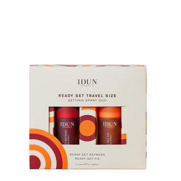 READY SET FIX Travel Size. En ultra-fixerande setting spray som fixerar och förlänger hållbarheten på din makeup. IDUN Minerals Ready Set Fix Setting Spray får din makeup att hålla för både en lång arbetsdag eller en sen utekväll, så att du är redo för allt! Använd som ett sista steg i din makeup-rutin för att smälta samman makeupen med huden och få ett jämnt resultat. Med den viktlösa och icke-klibbiga formulan får din hy en naturlig lyster. READY SET REFRESH Travel Size. En all-in-one ultralätt setting spray som förbereder, fixerar makeup och återfuktar huden med en ”glowy” finish. IDUN Minerals Ready Set Refresh Setting Spray med sin viktlösa formula får din makeup att sitta bättre och längre och ger en omedelbart återfuktad och uppfriskande effekt. Berikad med glycerin som låser in fukt i huden och niacinamid (3%) som stärker hudbarriären, ökar hudens elasticitet och förbättrar hudens utseende. Denna multifunktionella produkt håller din hud i balans och kan användas som primer för att återfukta huden innan din bas, mellan olika steg i din makeuprutin och som avslutande finish för att jämna ut, ta bort den pudriga looken och fixera makeupen. Den smidiga storleken på 50 ml gör det enkelt att ta med din favorit setting spray on the go, så varför inte ha en i badrumsskåpet, en i väskan och en framför datorn för en återfuktad och strålande känsla under hela dagen. IDUN Minerals Setting Sprays är veganska, parfymfria och dermatologiskt testade. Passar alla hudtyper, även de mest känsliga. Flaskorna är tillverkade av 100% återvunnen PET. Pumpen och locket är gjorda av PP-plast. Sorteras som plastförpackning.