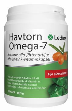 Ledins Havtorn Omega-7 är ett kosttillskott med havtorn och jättenattljusfröolja. Havtorn är rikt på omega-7 och jättenattljusolja på omega-6. Innehåller även vitamin E, pantotensyra, zink och vitamin A. Vitamin A bidrar till att bibehålla normala slemhinnor. Zink och vitamin A bidrar till att bibehålla normal hud.