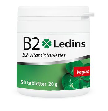 Ledins B2 (riboflavin) är ett kosttillskott med vitamin B2. Vitamin B2 bidrar till att minska trötthet och utmattning och bidrar till nervsystemets normala funktion.
