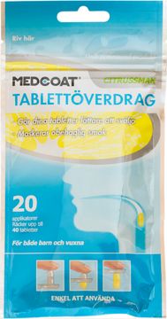 Medcoat är en dragering, ett överdrag för tabletter och kapslar. En dragerad tablett blir hal i munnen och ökar salivbildningen, vilket gör tabletten lättare att svälja. Drageringen maskerar också tablettens smak med en smak av citrus. När du har svalt tabletten löser sig drageringen snabbt upp sig. Medcoat innehåller endast livsmedelklassade ingredienser och har inga kända interaktioner med läkemedel.