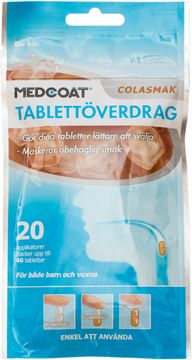 Medcoat är en dragering, ett överdrag för tabletter och kapslar. En dragerad tablett blir hal i munnen och ökar salivbildningen, vilket gör tabletten lättare att svälja. Drageringen maskerar också tablettens smak med en smak av cola. När du har svalt tabletten löser sig drageringen snabbt upp sig. Medcoat innehåller endast livsmedelklassade ingredienser och har inga kända interaktioner med läkemedel.