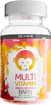 Vill du ge ditt barn ett jämnt intag av viktiga vitaminer? Monkids Multivitamin Sockerfri Barn Jordgubb är en god och lättuggad gummy med 11 vitaminer. Bland vitaminerna finns dagsbehovet av D-vitamin och vitamin B12. D-vitamin behövs för att barns benstomme ska växa och utvecklas normalt samt bidrar till ett normalt fungerande immunsystem. Gummyn har fin färg från svart morot, naturlig jordgubbssmak och tillverkas i Sverige. Passar från 3 år. Produkten innehåller sötningsmedel.