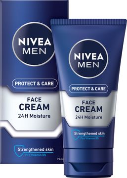125 krI apotek: 125 kr-Ansiktskräm återfuktar huden i 24 hAloe Vera återbygger huden -Provitamin B stärker huden-Icke-fet, absorberas snabbtHåll din hud återfuktad och stark med NIVEA MEN Protect & Care Moisturiser Face Cream. Detta är en ansiktskräm som återfuktar huden omedelbart och stärker hudens naturliga barriär för att låsa in fukten. Berikad med Aloe Vera och Provitamin B5 som tar hand om huden och skyddar den från yttre påverkan som kan orsaka torrhet. Huden byggs upp och stärks efter rakning. Denna kräm för ansiktet lugnar, absorberas snabbt och är icke-kladdig. Passar alla hudtyper. Dermatologiskt testad. Håll din hud återfuktad och stark! För bästa resultat använd tillsammans med NIVEA® MEN Protect & Care Face Wash Gel samt NIVEA® MEN Protect & Care After Shave Balm efter rakning.Varningstext: Undvik kontakt med ögonen