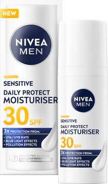NIVEA MEN Sensitive Daily Protect Moisturiser SPF30 är en ansiktskräm med högt solskydd som passar perfekt för känslig hud med sin innovativa trippelskyddande formula. Berikad med VitaminPRO-komplexet (Vitamin E och Provitamin B5) samt antioxidanter, skyddar denna lätta och snabbt absorberande fuktighetskräm din hud mot UVA/UVB-strålar, blått ljus och föroreningar. Den är idealisk för daglig användning och hjälper till att bevara hudens naturliga balans samt skydda mot yttre påfrestningar. Formulan ger en omedelbar fuktboost, vilket lämnar din hud återfuktad och fräsch hela dagen. Den är speciellt utformad för känslig hud och är dermatologiskt godkänd och kan användas efter rakning för extra skydd. Applicera dagligen på ett rengjort ansikte och hals.