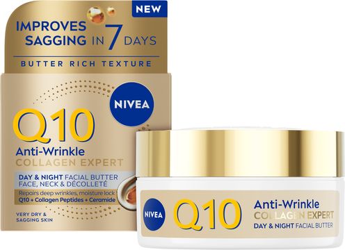 NIVEA Q10 Anti-Wrinkle Collagen Expert Day & Night Facial Butter är en intensivt återfuktande ansiktskräm, perfekt för mycket torr hud och hud som saknar fasthet. Passar lika bra i morgonrutinen som i kvällsrutinen. Med en rik, smörig textur smälter den enkelt in i huden och stärker fuktbarriären på djupet. Krämen innehåller Q10 för att öka hudens cellkraft, kollagenpeptider för att förbättra elasticiteten och ceramider för att låsa in fukt.