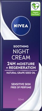 Nya NIVEA Soothing Night Cream är en nattkräm framtagen för känslig hud. Formulan med druvkärnolja, lakritsextrakt och provitamin B5 återfuktar huden och balanserar därmed hudens egen fuktnivå. Ansiktskrämen stödjer hudens naturliga motståndskraft mot hudirritation och återuppbyggnad samt återfuktar huden intensivt under natten. Krämen reducerar de 3 huvudsakliga tecknen på känslig hud: rodnad, stramhet och torrhet. Denna nattkräm är fri från parfym och är dermatologiskt testad. Den har dessutom en vegansk formula –fri från animaliska ingredienser. För bästa resultat, använd hela NIVEAs serie för känslig hud, exempelvis vår nya dagkräm på tub NIVEA Soothing Day Cream.