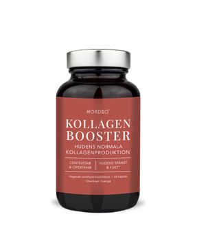 NORDBO Kollagen Booster är ett veganskt kosttillskott för hudens spänst och lyster, vilket kan minska förekomsten av fina linjer. Ett perfekt alternativ för den som inte vill använda sig av animaliskt kollagen.Med växtextrakten Opextan® och Centevita® samt C-vitamin och biotin. *C-vitamin bidrar till normal kollagenbildning som har betydelse för hudens normala funktion. Biotin bidrar till att bibehålla normal hud, hår och naglar.Centevita® utvinns ur gotu kola-blad och har dokumenterad effekt på ökad spänst och lyster i huden efter endast 90 dagar. Opextan® utvinns ur italienska Coratina-oliver, som är ovanligt rika på antioxidanter som minskar den oxidativa stressen i hudcellerna samt främjas hudens förnyelse.Endast 2 kapslar dagligen.Kollagen Booster är veganskt certifierad av Djurens Rätt.Burken är av glas och locket av metall. Glas och metall kan återvinnas oändligt och ger ett fullständigt skydd mot fukt och luft.Produkten är utvecklad av NORDBO - ett familjeägt varumärke från Malmö, som tar fram kosttillskott utifrån innovation, dokumentation och hållbarhet.