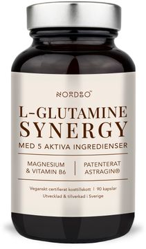 NORDBO L-Glutamine Synergy är ett synergistiskt komplex med L-glutamin, magnesiumbisglycinat, Le Guerandais havssalt, vitamin B6 och Astragin®.