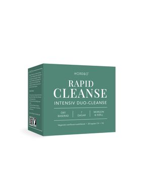 NORDBO Rapid Cleanse är en 7 dagar lång, intensiv reningskur med bl.a. kronärtskocka, gurkmeja, rabarber, magnesium, chlorella och spirulina. Med en skräddarsydd formulering för morgonen och en för kvällen jobbar Rapid Cleanse dygnet runt för att stödja kroppens reningsorgan: levern, njurarna, blodet, lymfan, huden, lungorna och tarmen.Rabarberrot bidrar till regelbunden tarmfunktion och kronärtskocka stödjer matsmältningen.Rapid Cleanse är ett perfekt val för den som vill köra en välbeprövad och tidseffektiv detox.Det är vanligt med utrensningssymptom de första dagarna. Prioritera vila och kom ihåg att äta varierat och dricka tillräckligt med vatten. Vid behov kan dosen halveras.Råd under din kur:Tänk på att dricka tillräckligt med vattenMånga mår bra av att äta små och regelbundna måltiderUndvik gärna socker, koffein, alkohol och svårsmälta livsmedelPrioritera återhämtningPrioritera promenader och lättare träningRapid Cleanse är veganskt certifierad av Djurens Rätt.Burkarna är av glas och locket av metall. Glas och metall kan återvinnas oändligt och ger ett fullständigt skydd mot fukt och luft. Ytterförpackningen består av återvunnet, FSC-certifierat papper.Produkten är utvecklad av NORDBO - ett familjeägt varumärke från Malmö, som tar fram kosttillskott utifrån innovation, dokumentation och hållbarhet.