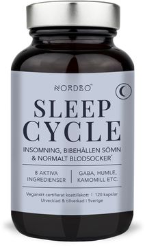 NORDBO Sleep Cycle är framtagen för att stödja sömncykeln, med fokus på insomning, sammanhängande sömn och stabilt blodsocker. Med 8 aktiva ingredienser: GABA, citronmeliss, kamomill, humle, mullbär, magnesium, grönt te och krom.GABA (gammaaminosmörsyra) har en hämmande effekt på signalsubstanserna i nervsystemet, vilket minskar aktiviteten i den del av hjärnan som håller oss vakna.Även L-teanin av grönt te bidrar till att minska aktiviteten i nervsystemet. Studier visar att L-teanin i kombination med magnesium kan öka antalet timmar av sammanhängande sömn.Citronmeliss och kamomill är två välbeprövade ingredienser som bidrar till optimal fysisk och mental avslappning samt vilsam sömn. Kamomill innehåller flavonoiden apigenin, som binder bensodiazepinreceptorer i hjärnan, vilka i sin tur reglerar GABA i hjärnan.Humle har en lugnande effekt och främjar god sömn och insomning samt avslappning när kroppen är uppe i varv.Magnesium bidrar till nervsystemets och musklernas normala funktion.Krom och mullbär bidrar till stabila glukosnivåer i blodet. Studier visar att blodsockerkurvan har betydelse för sömnkvaliteten och hur mycket sammanhängande sömn vi får under natten.Ett perfekt tillskott för den som har problem med lång insomning eller ofta vaknar under natten.Sleep Cycle Support är veganskt certifierad av Djurens Rätt. Produkten är fri från animaliska ingredienser samt gluten, socker, soja och laktos.Produkten är utvecklad och tillverkad i Sverige av NORDBO - ett familjeägt varumärke från Malmö, som tar fram kosttillskott utifrån innovation, dokumentation och hållbarhet.Burken är tillverkad av glas och locket av metall. Glas och metall kan återvinnas oändligt och ger ett fullständigt skydd mot fukt och luft.