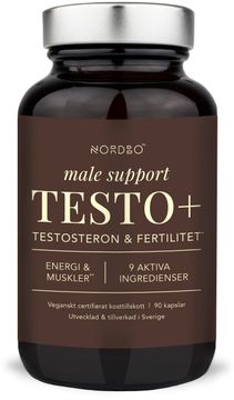 Nordbo Testo+ är ett synergistiskt komplex utvecklat för män som vill bibehålla normala testosteronnivåer och minska trötthet. Med nio aktiva ingredienser: bockhornsklöver, magnesium, L-arginin, panax ginseng, rödbeta, L-citrullin, selen, zink och D3V® (vitamin D3). Bockhornsklöver (Trigonella foenum-graecum) är en ettårig ört i ärtväxtfamiljen, med små blad och karakteristiska frökapslar. Extraktet är rikt på bioaktiva ämnen, särskilt saponiner (20%), som har strukturella likheter med vissa kroppsegna molekyler. Panax ginseng är en adaptogen som bidrar till att bibehålla normal fysisk och mental funktion vid trötthet och utmattning. L-arginin och L-citrullin är aminosyror som ofta används inom träning och prestation. De fungerar som förstadier till kväveoxid. Magnesiumbisglycinat är en magnesiumform med hög biotillgänglighet, där magnesium har bundits till aminosyran glycin. Magnesium bidrar till att bibehålla normal muskelfunktion och energiomsättning samt till minskad trötthet och utmattning. Rödbetsextrakt är vanligt förekommande inom elitidrott och träning. Zinkpikolinat är en biotillgänglig form av zink som bidrar till att bibehålla normala testosteronnivåer i blodet, normal fertilitet och reproduktion samt immunsystemets normala funktion. Selenmetionin är en organisk form av selen. Selen bidrar till att bibehålla normal spermatogenes och sköldkörtelfunktion, samt skydd av celler mot oxidativ stress. D3V® utvinns ur alger - en vegansk källa till vitamin D3, fri från bekämpningsmedel. Algerna är av europeiskt ursprung och naturligt rika på vitaminet. Vitamin D3 bidrar till att bibehålla immunsystemets normala funktion, musklernas normala funktion och normal benstomme. Testo+ är veganskt certifierad av Djurens Rätt. Produkten är utvecklad och tillverkad i Sverige av Nordbo – ett familjeägt varumärke från Malmö, som tar fram kosttillskott utifrån innovation, dokumentation och hållbarhet. Burken är tillverkad av glas och locket av metall. Glas och metall kan återvinnas oändligt och ger ett fullständigt skydd mot fukt och luft.
